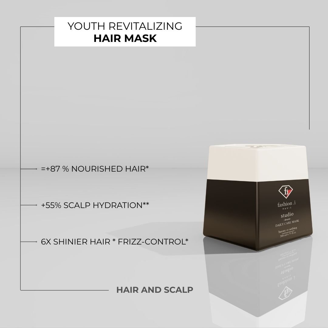 Fashion I Paris ’s Densite Mask – Intense Regenerant is a luxurious youth revitalizing hair mask designed to deeply nourish, hydrate, and repair damaged strands. Enriched with Hyaluronic Acid, Abyssinia Oil, and Vitamin E, this advanced formula targets both the scalp and hair fiber to restore softness, enhance natural shine, and protect against external stressors. Delivering clinically proven results, the Densite Mask ensures 87% nourished hair, 55% scalp hydration, 6x shinier results, and 48 hours of frizz-free smoothness.