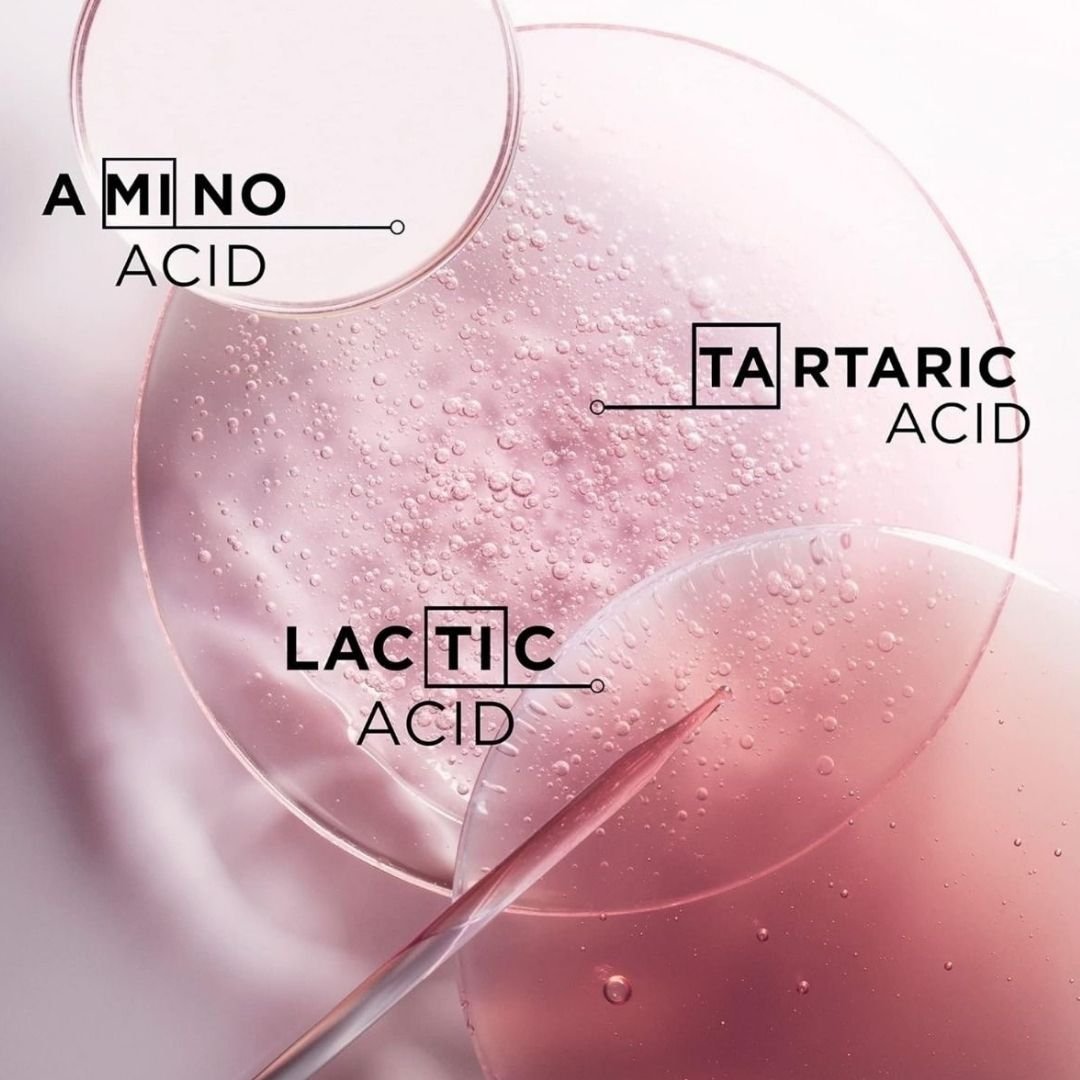 The inclusion of Centella Asiatica, a regenerative botanical extract known for its healing properties, enhances scalp and hair health. Meanwhile, the powerful acids work together to repair internal damage, smoothen the surface, and protect against oxidative stress caused by environmental aggressors.
